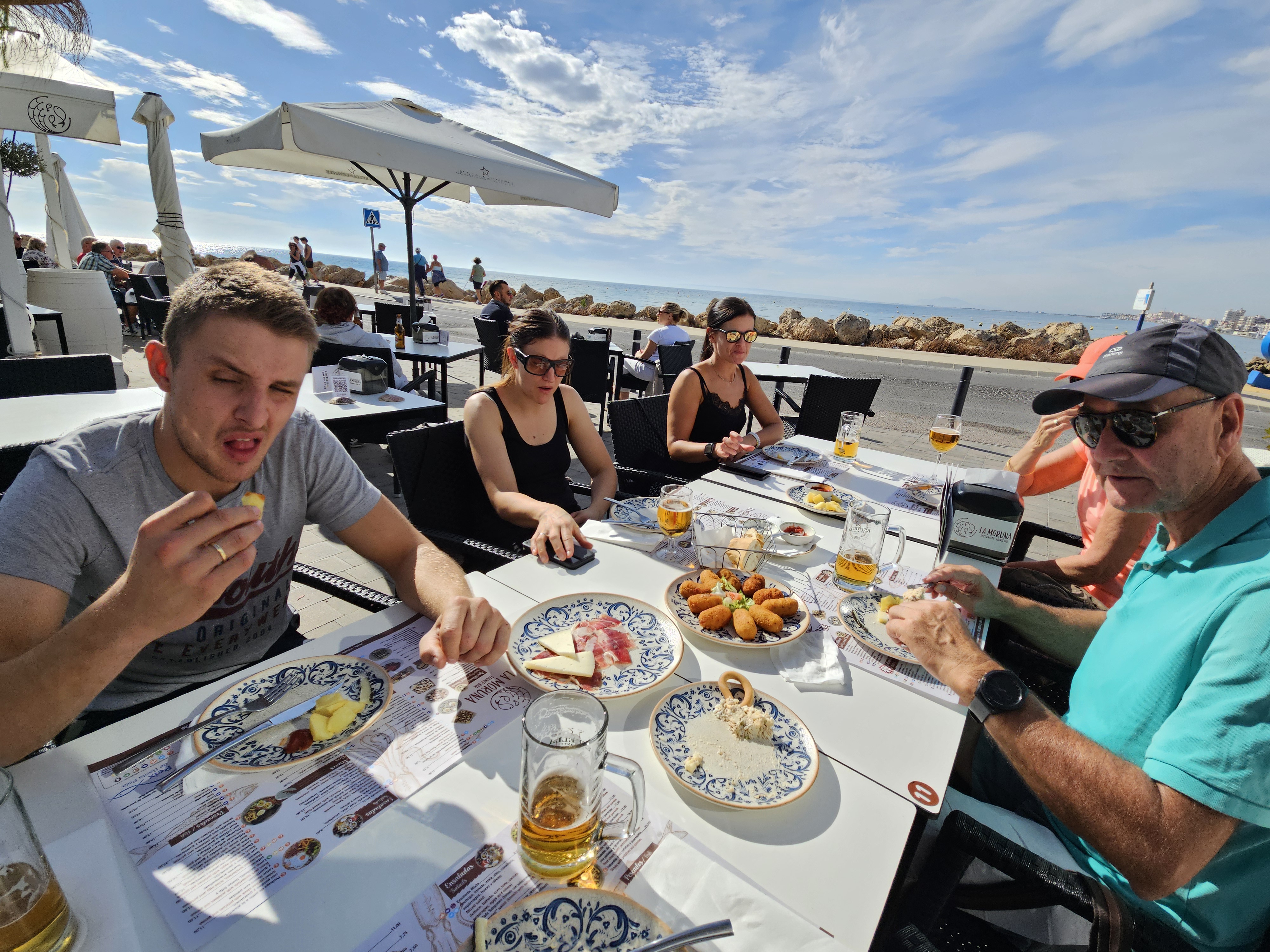 Sigbjørn og Gunn møtte dem til lunsj og denne gangen ble det tapas ved promenaden. Trygve og Sigbjørn prøvde seg på grillet calamari (de trodde den skulle være sprøstekt) og Trygve innså plutselig hvorfor ungene til Elin er så ekstremt kresne.