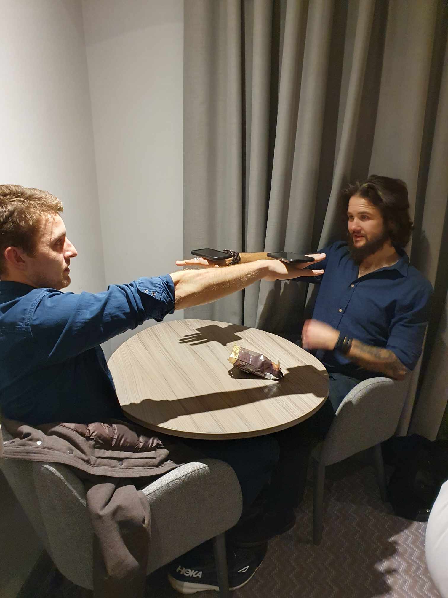 På dag to var første oppdrag å finne frokost. Trygve fikk te istedet for kaffe og Herman vet tydeligvis ikke hva arme ridere er, men det smakte godt og han ved siden av oss var passe gal og undeholdene.
